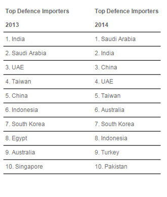 全球十大軍火進(jìn)口國(guó)的榜單在2014年發(fā)生洗牌。除了沙特超越印度外,中國(guó)成為第三大軍火進(jìn)口國(guó),澳大利亞從第九攀升至第六,土耳其和巴基斯坦進(jìn)入十強(qiáng),而埃及和新加坡退出這一榜單,韓國(guó)仍然名列第七。