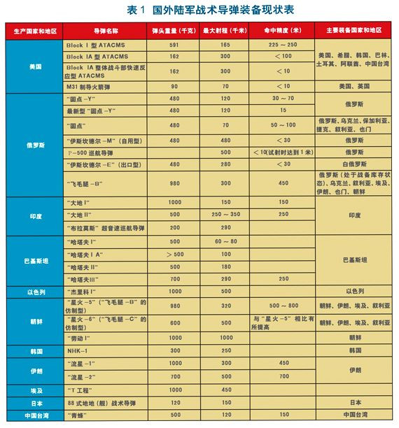 目前世界上已有30多個國家和地區的陸軍裝備有戰術彈道導彈,其中近20個國家和地區有生產戰術彈道導彈的能力。截止到2010年底,除美國、俄羅斯、中國外,其他國家大約總共擁有5900枚彈道導彈和數百件發射載具,其中朝鮮擁有1000多枚,60%~80%為仿制的“飛毛腿”系列戰術彈道導彈。俄羅斯和印度陸軍已分別裝備了Р-500巡航導彈和“布拉莫斯”超音速巡航導彈。國外陸軍戰術導彈的具體裝備現狀見下表(表中未列出曾經裝備過但目前已中止裝備戰術彈道導彈的主要國家,如法國、英國、德國、意大利等)。